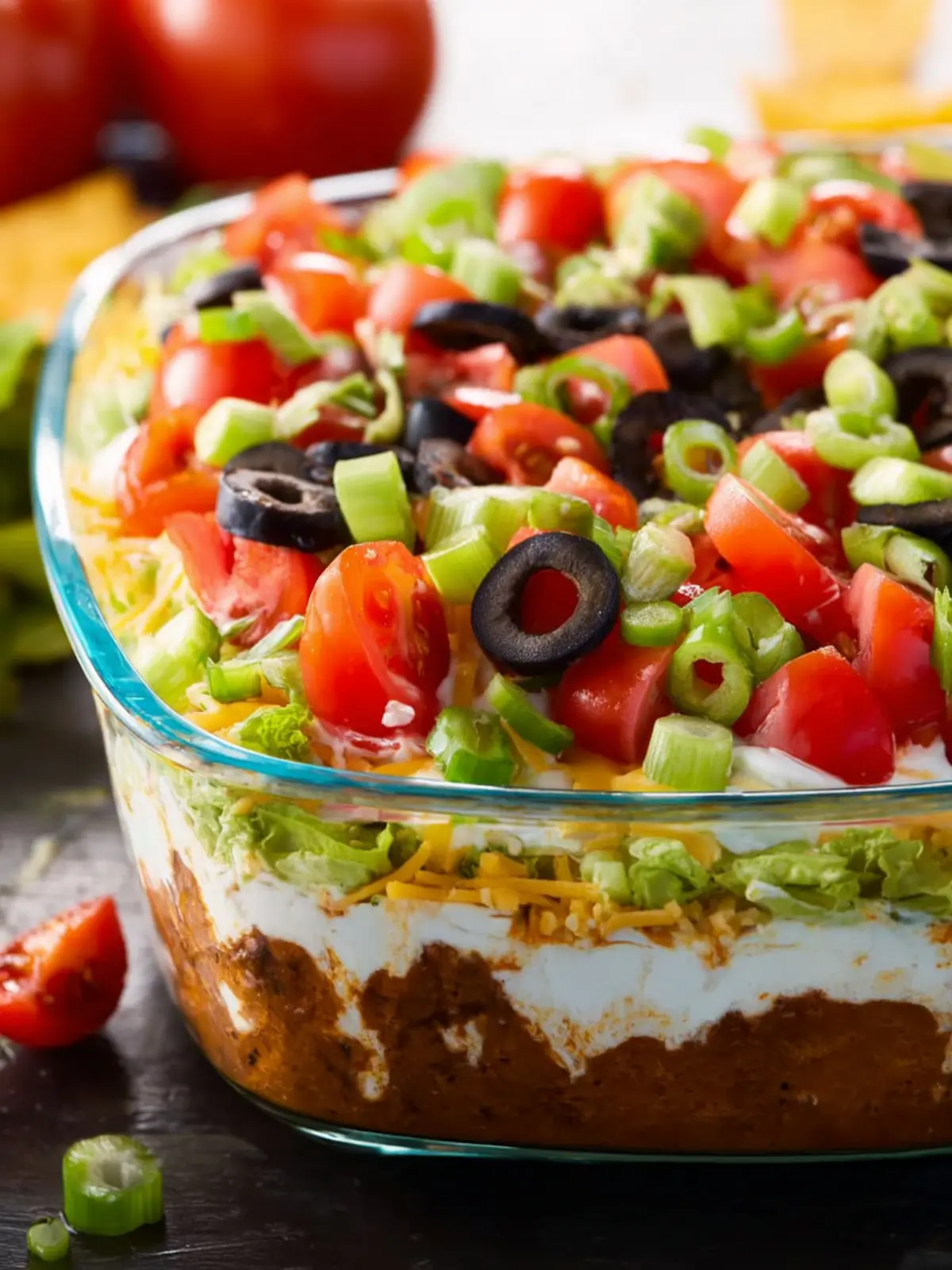 - Top with the cheese, then the tomatoes, green onions, and olives. Serve with tortilla chips.