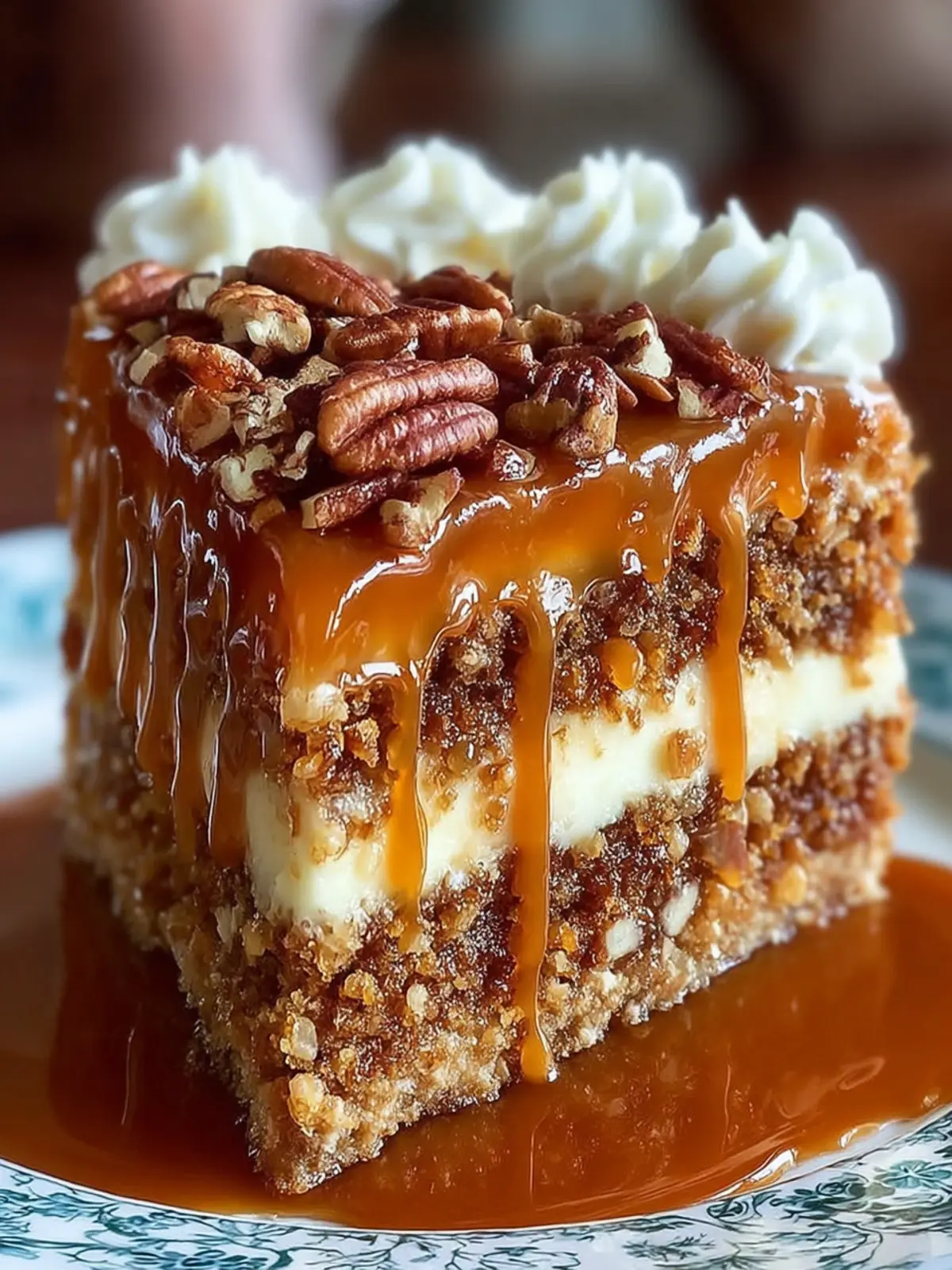 - Assemble the Cake: Place one cake layer on a serving plate. Spread half of the cream cheese frosting over the top. Place the second cake layer on top and spread remaining frosting on top. Drizzle the top with the remaining caramel sauce. Decorate with whole pecan halves if desired.
