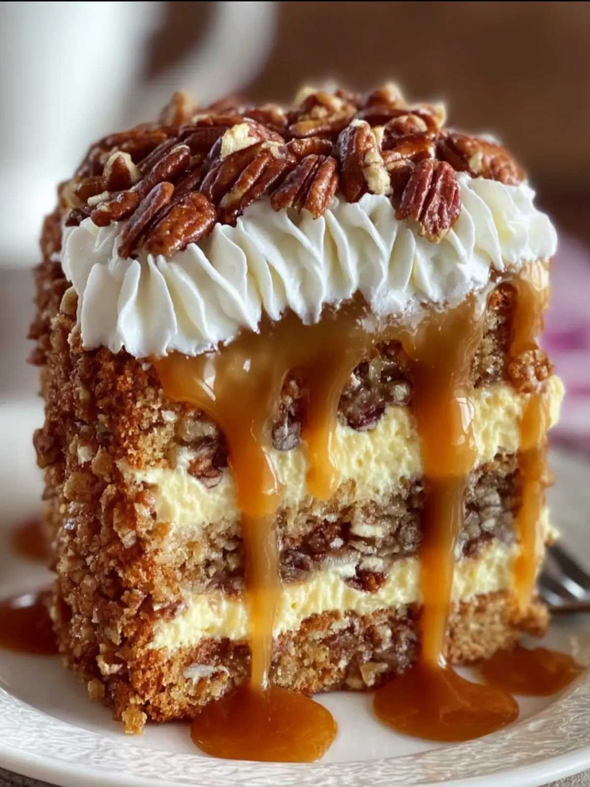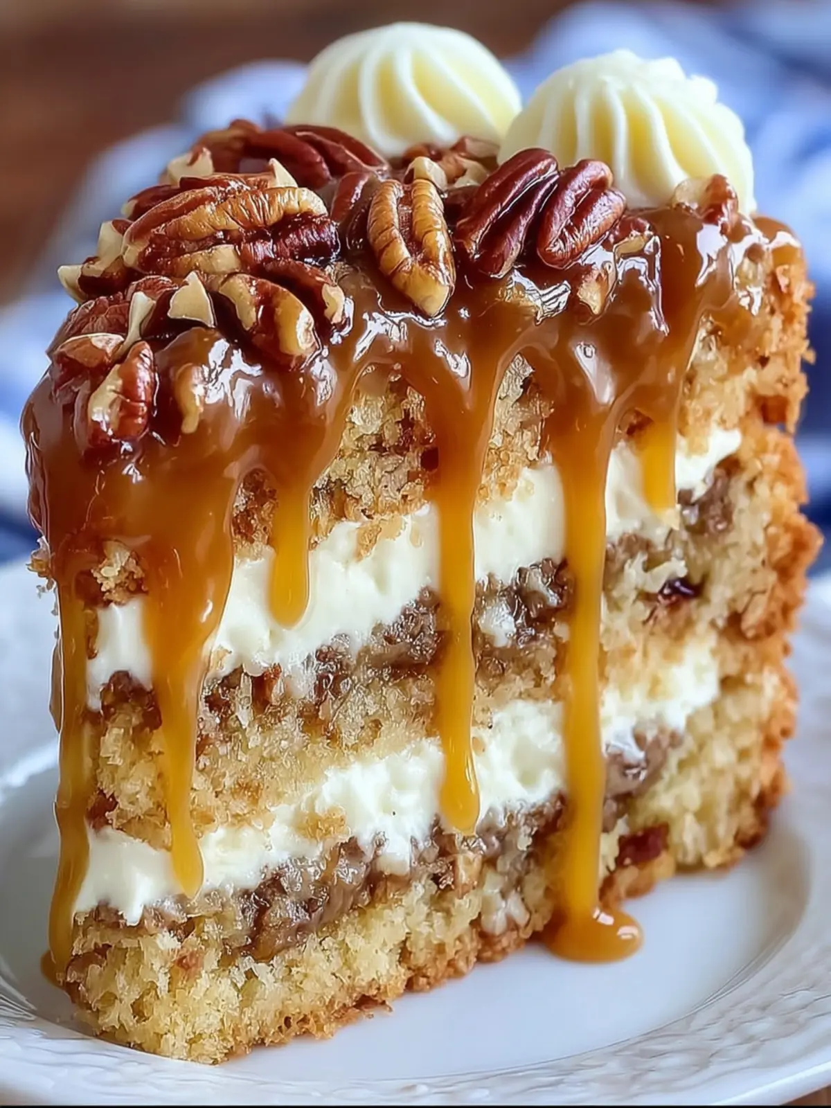 Layering Perfection: The cake comprises not just one but multiple layers, ensuring that each slice is a harmonious blend of textures—soft and airy cake meets creamy frosting and crunchy pecans.