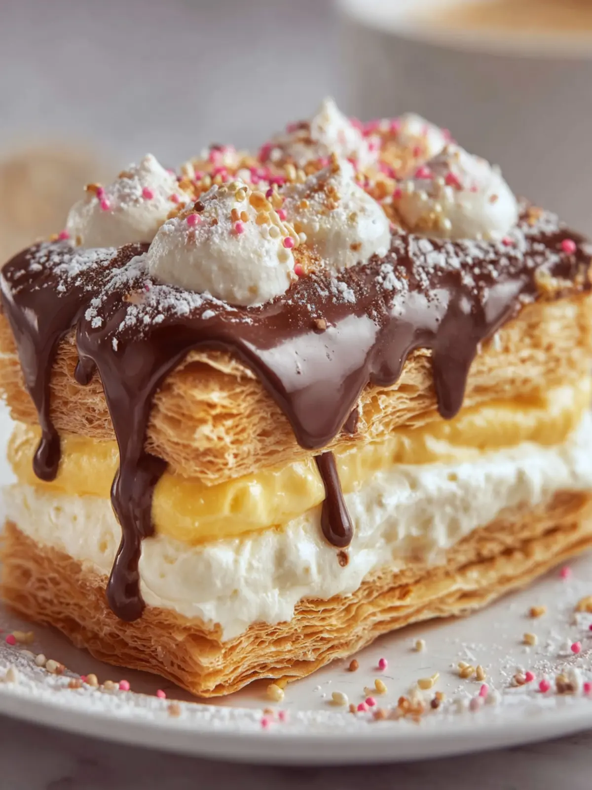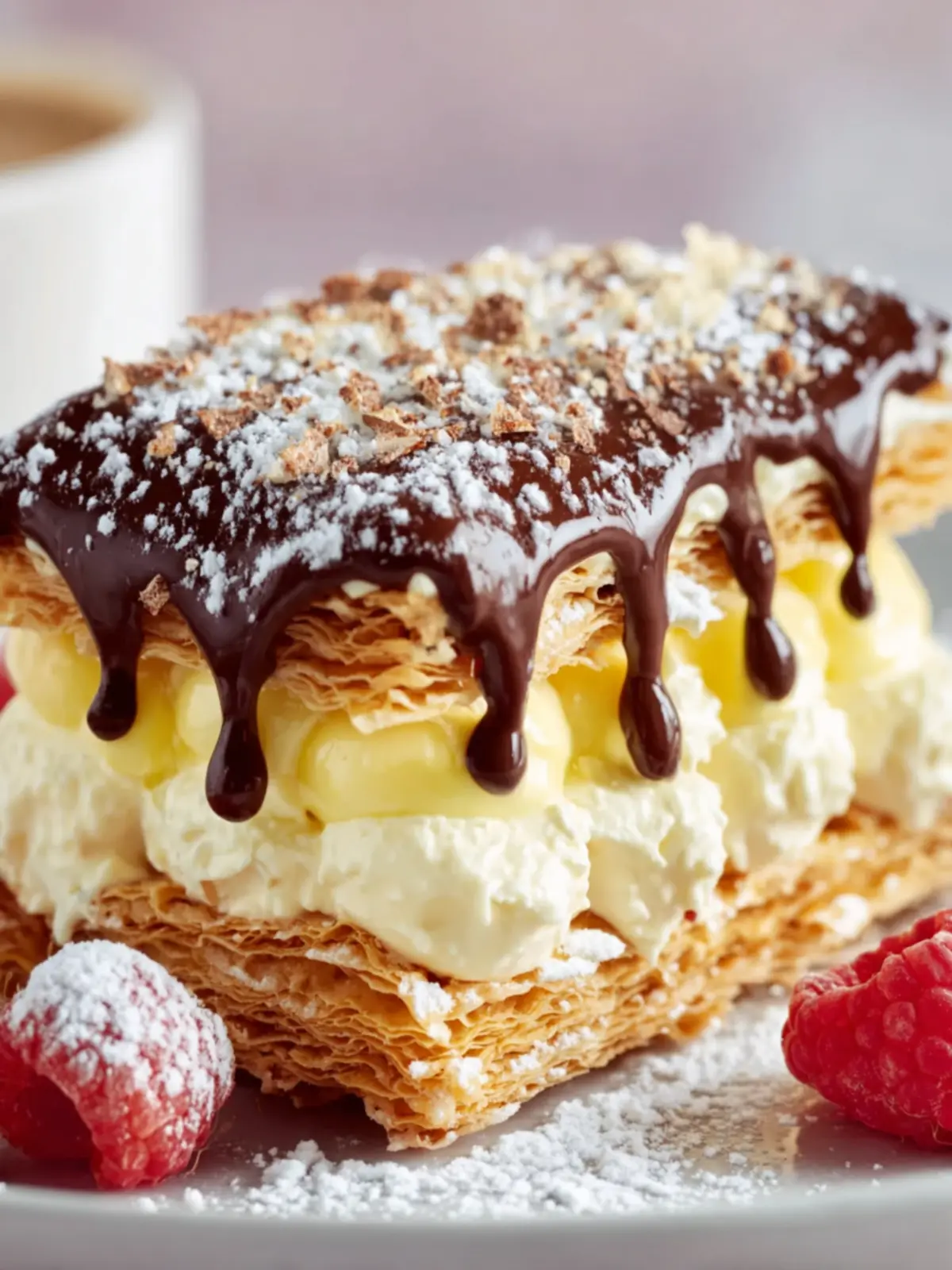 A delicious and indulgent dessert featuring layers of puff pastry, vanilla custard, and rich chocolate ganache.