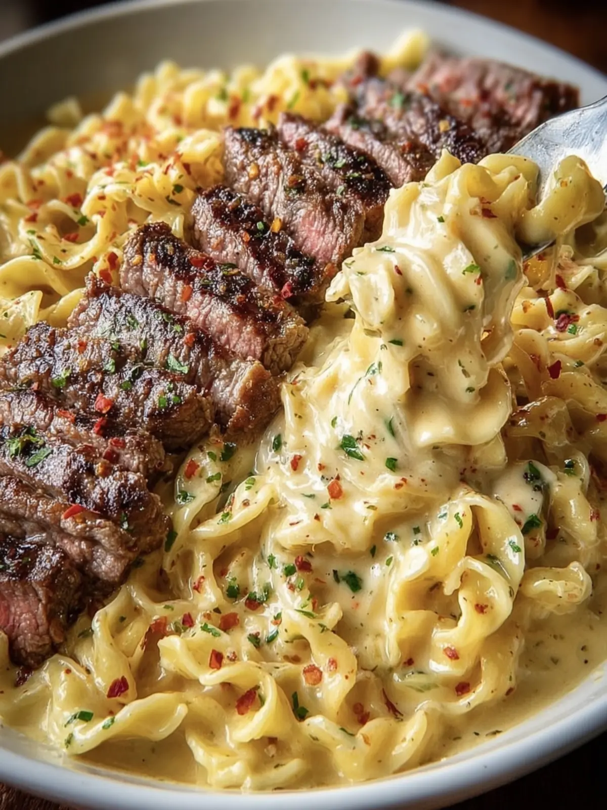 4. Combine and Serve: Add the cooked fettuccine to the creamy sauce and toss to combine. Slice the rested steaks against the grain and serve on top or alongside the pasta. Garnish with fresh parsley.