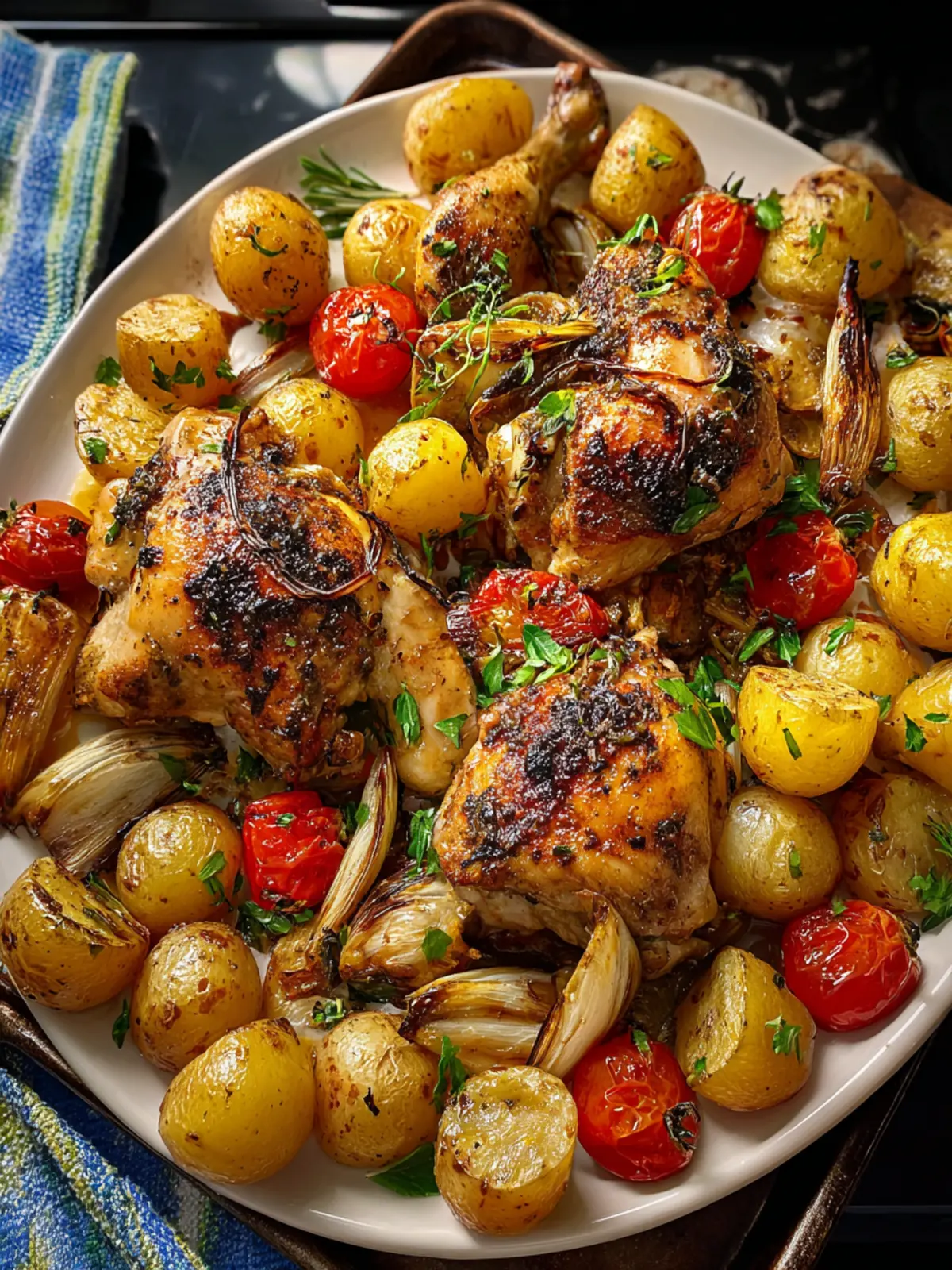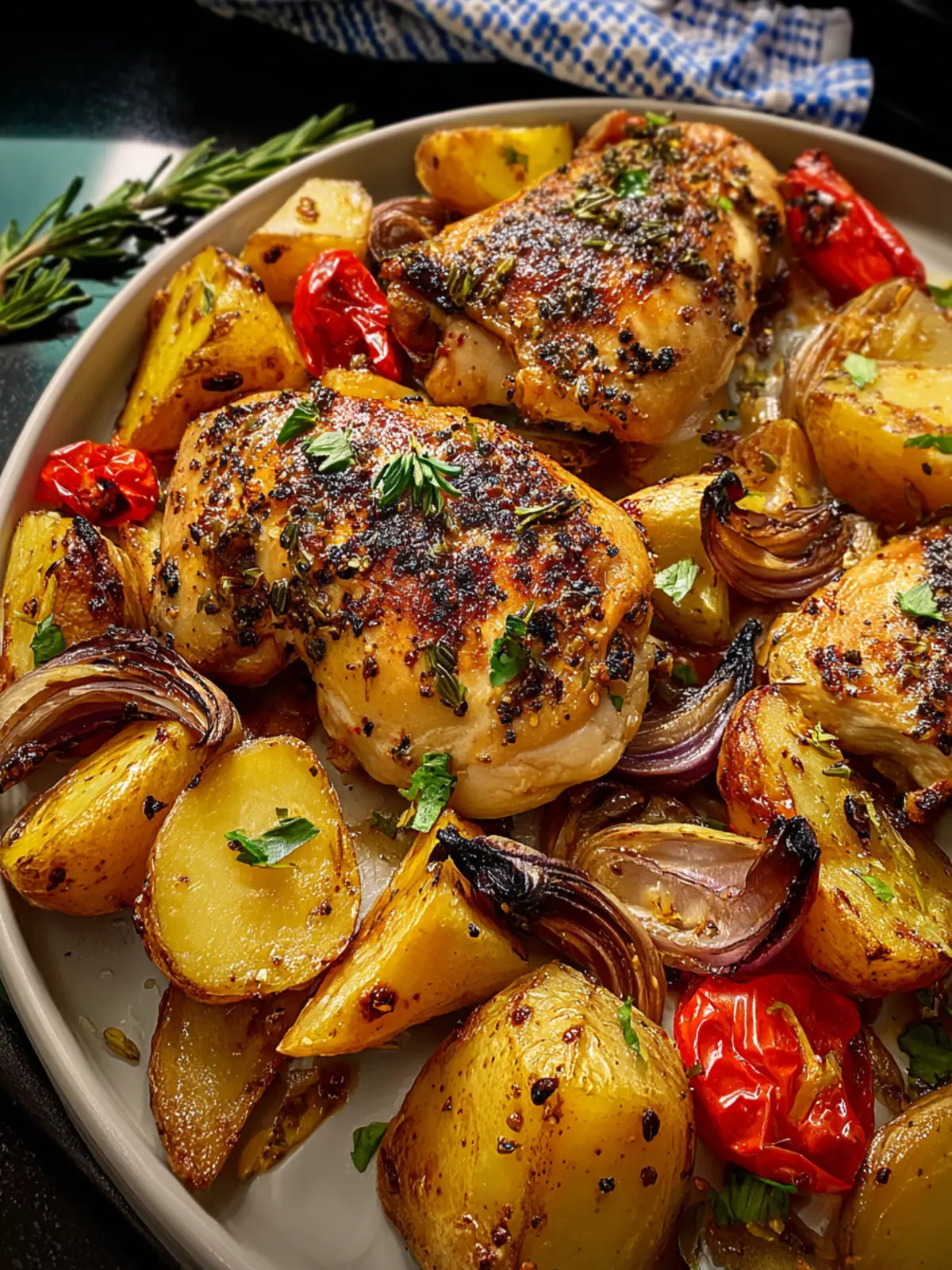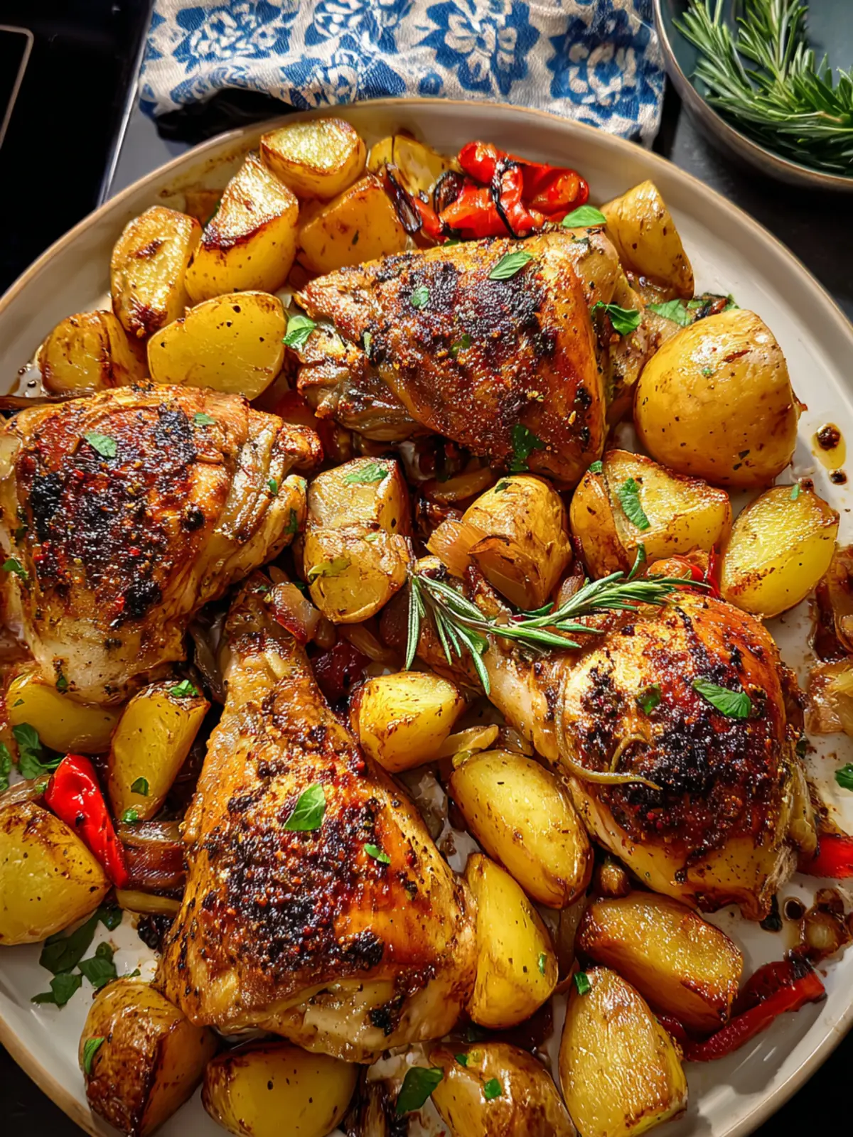 Juicy roasted chicken thighs paired with crispy baby potatoes, seasoned with fresh rosemary and garlic.