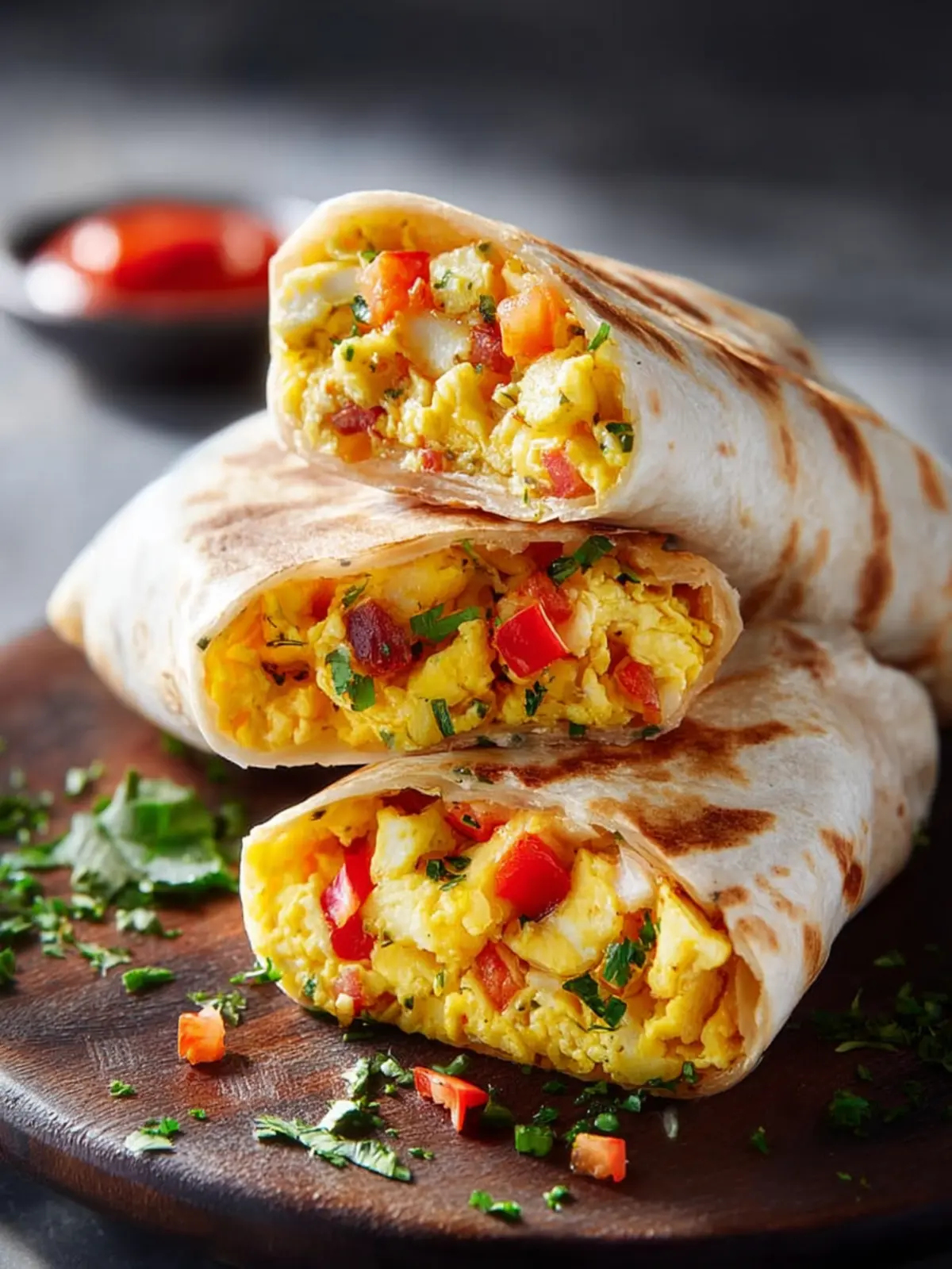 Delicious breakfast burritos filled with scrambled eggs, potatoes, cheese, and veggies.