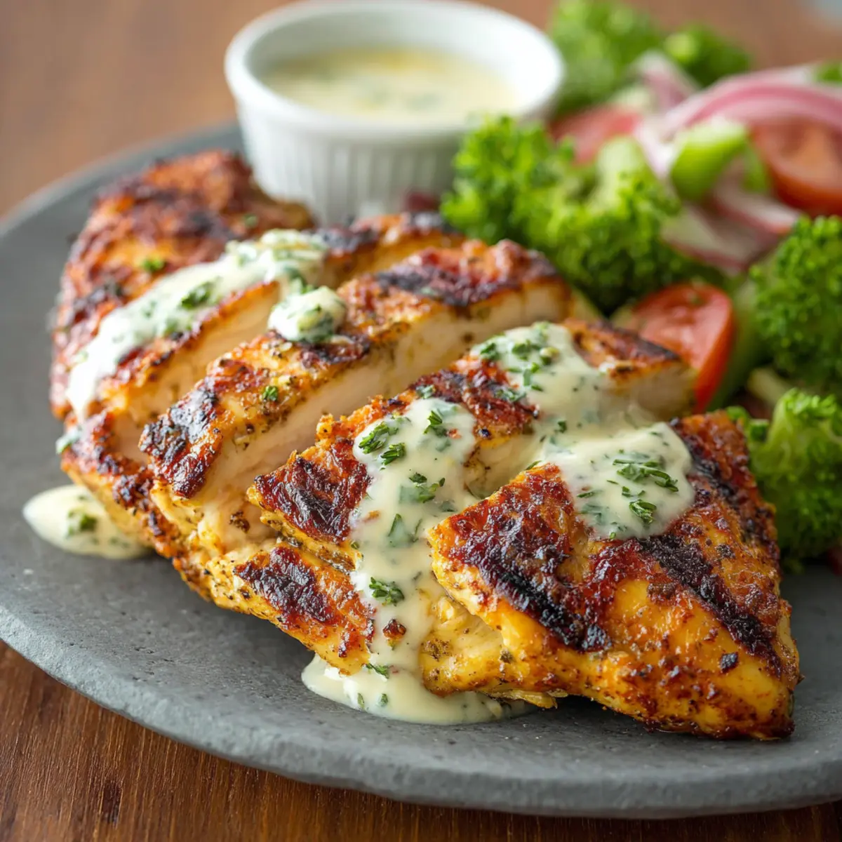 Add Ranch Dressing: Once the chicken is grilled, place it on the prepared plate. Drizzle the ranch dressing over the chicken and vegetables. Sprinkle chopped parsley on top for garnish.