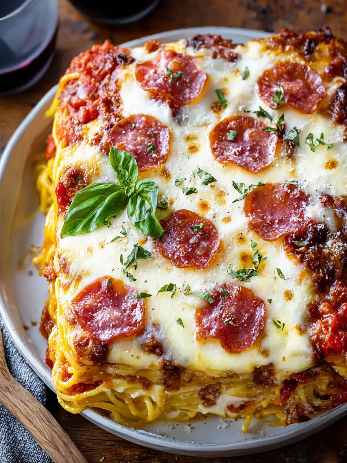 A hearty spaghetti casserole with a delicious blend of meats, cheeses, and spices, perfect for a comforting family meal.