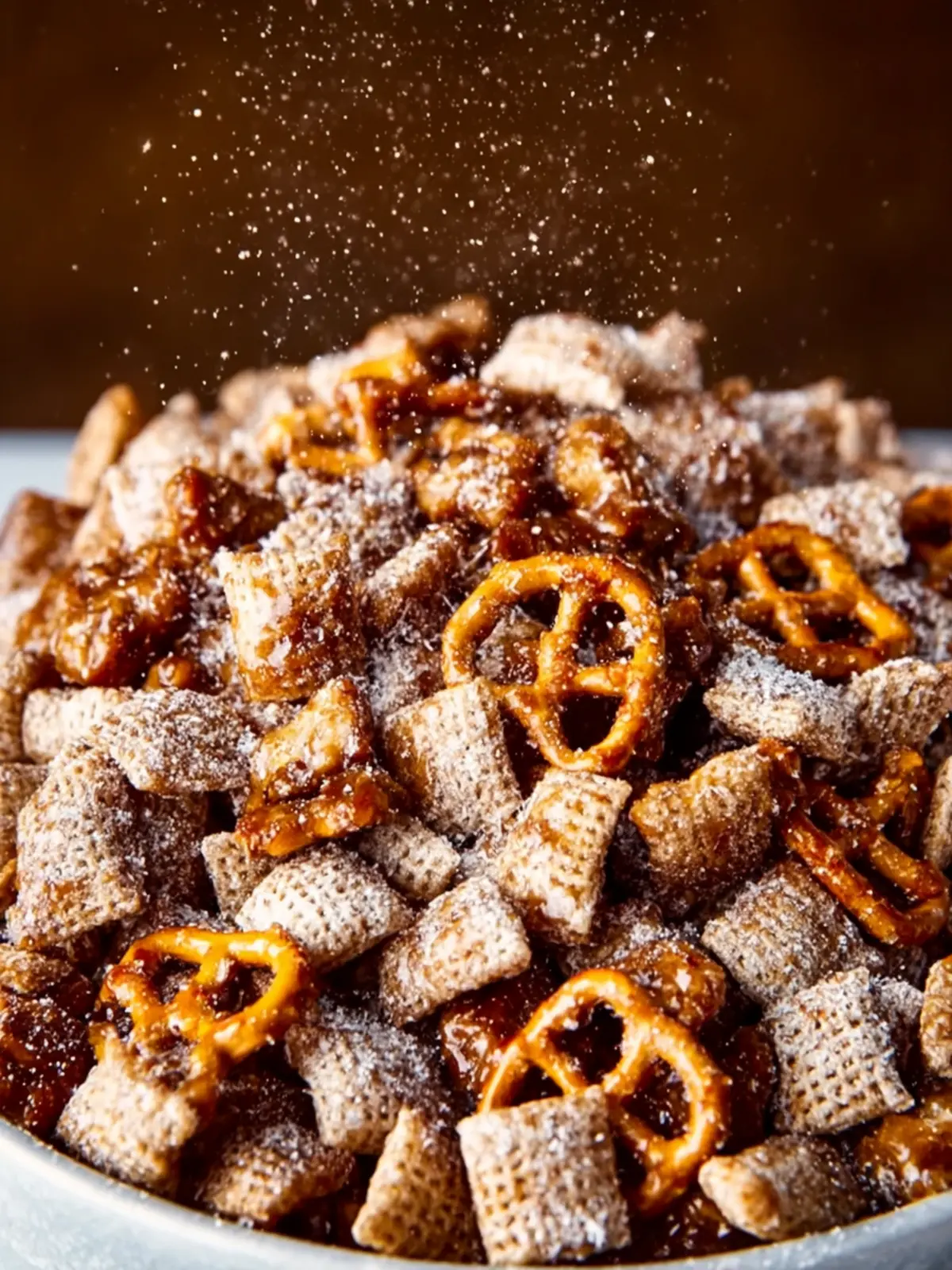 Visually Appealing: With its golden caramel hues and scattered bits of pretzel, this puppy chow doesn’t just taste good; it looks tempting, too.