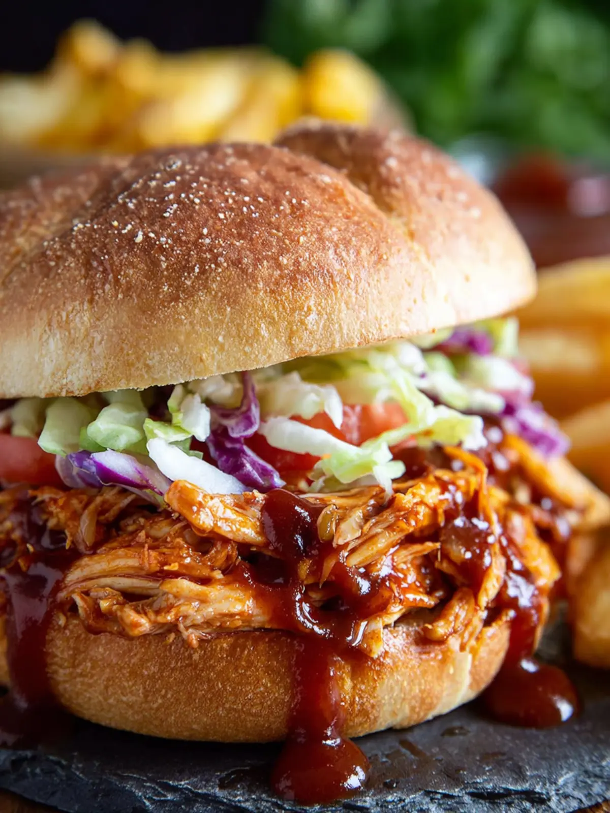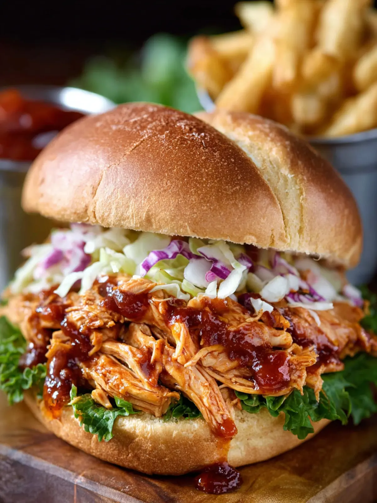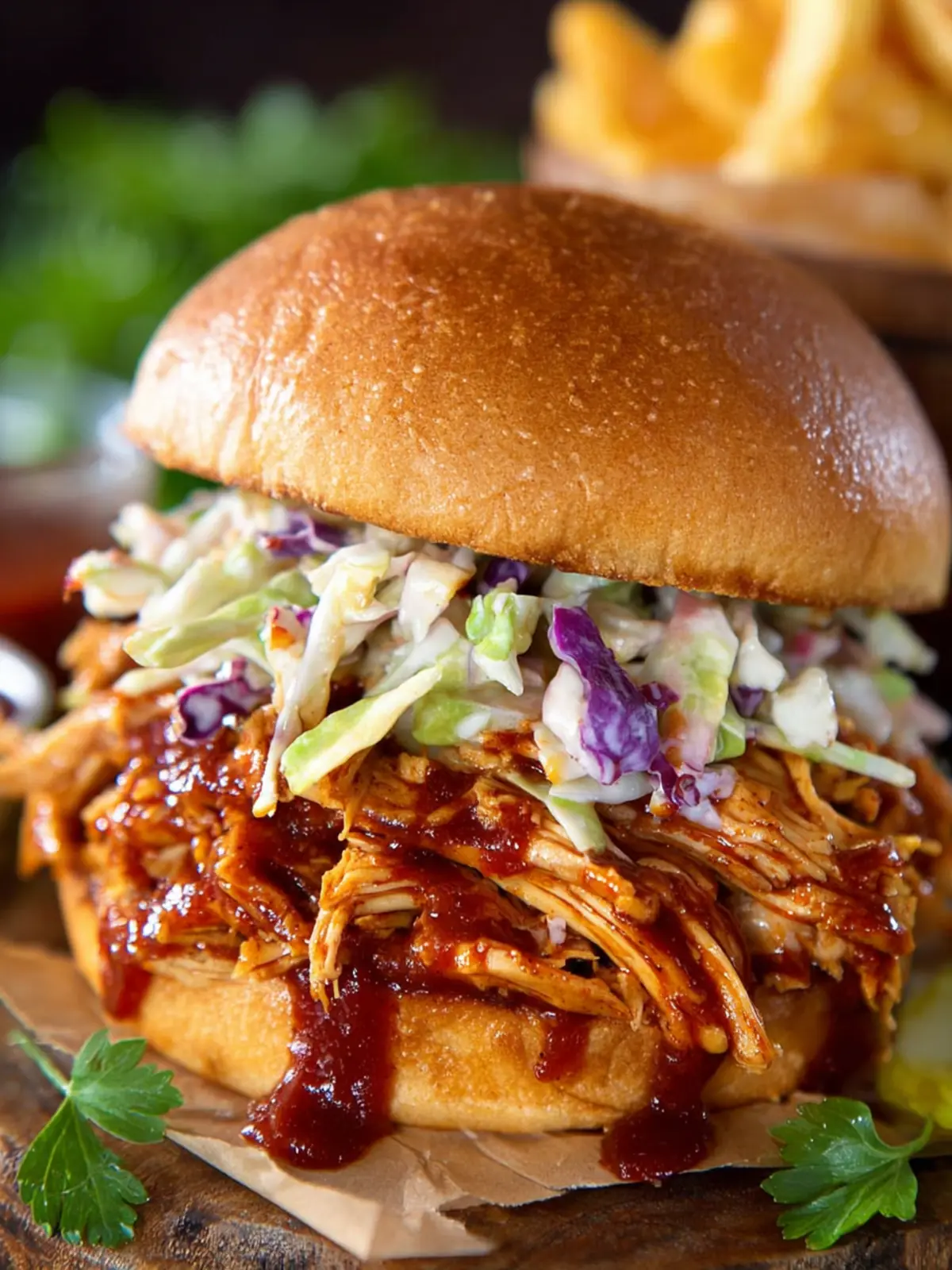 As the chicken simmers in a tangy BBQ sauce, it becomes perfectly tender and flavored with a smoky sweetness that complements the soft, pillowy buns perfectly. Whether you’re hosting a game day gathering or simply whipping up a weeknight dinner, this sandwich is bound to be a crowd-pleaser. Not only does it cater to your cravings for comfort food, but it also encourages you to gather around the table—something we could all use more of in our busy lives.
