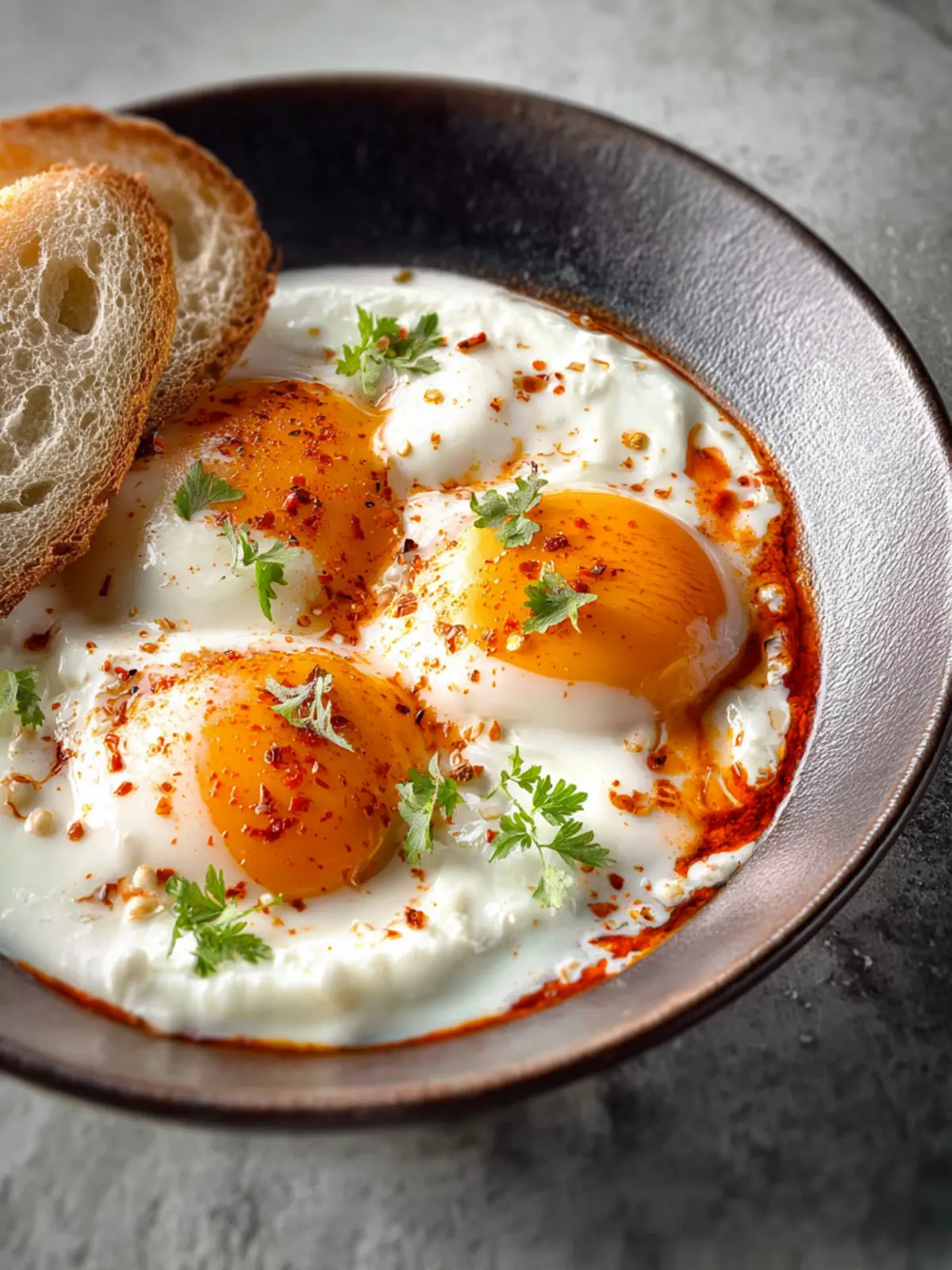 The best way to enjoy Turkish eggs is with a side of warm, crusty bread. Whether you choose a fresh baguette, pita, or rustic sourdough, the bread acts as a perfect vehicle for those silky yolks and spiced yogurt.